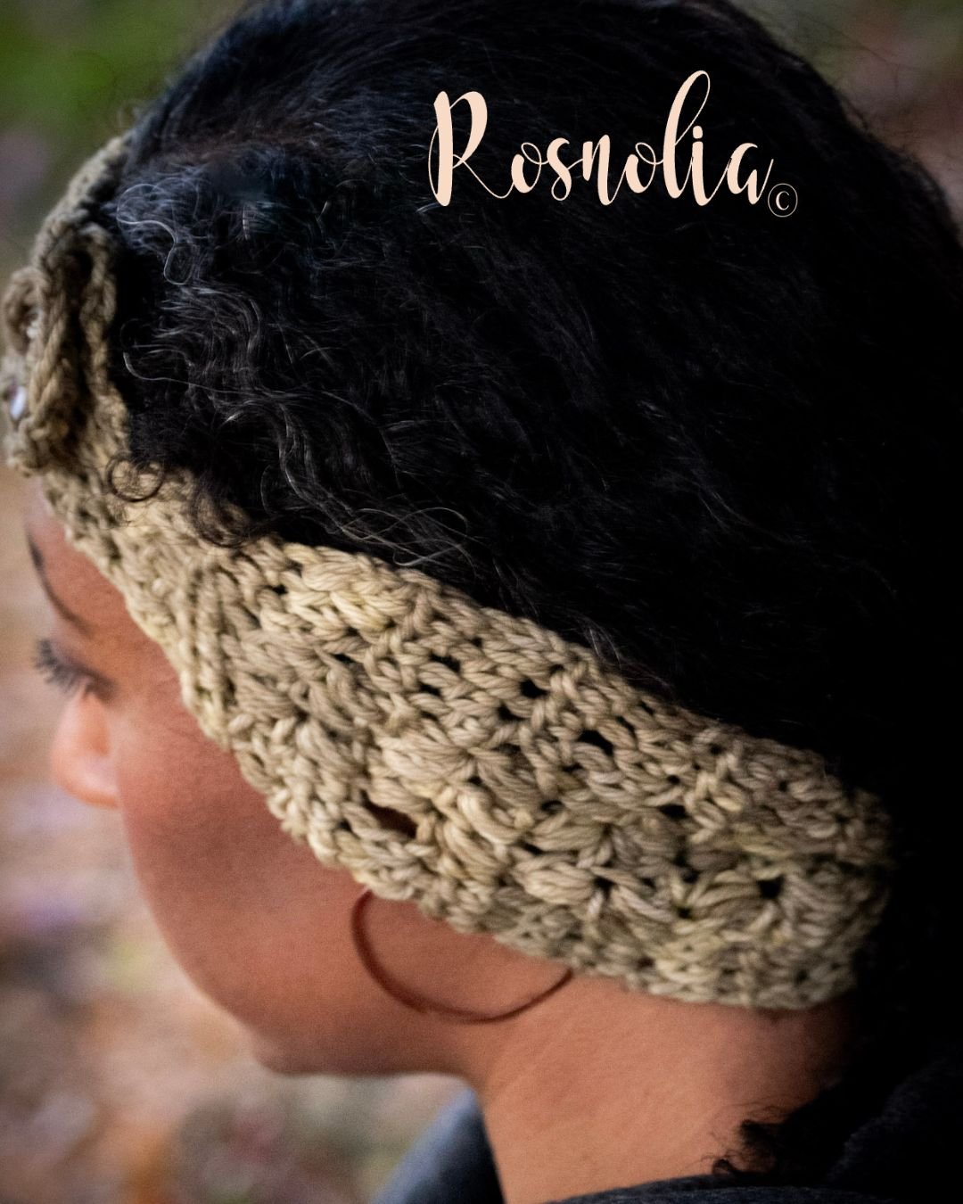The Coffee Bean Ear Warmer is inspired by a design from LeftinKnots.com. The design features the coffee bean stitch throughout with a tapered button closure for easy placement on the hairline. With the simple wooden button closure, you can easily take the band on and off without messing up your ponytail, or creating hat hair.